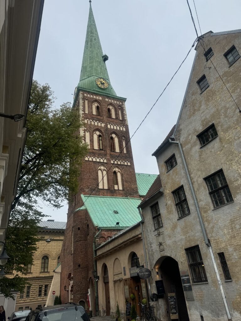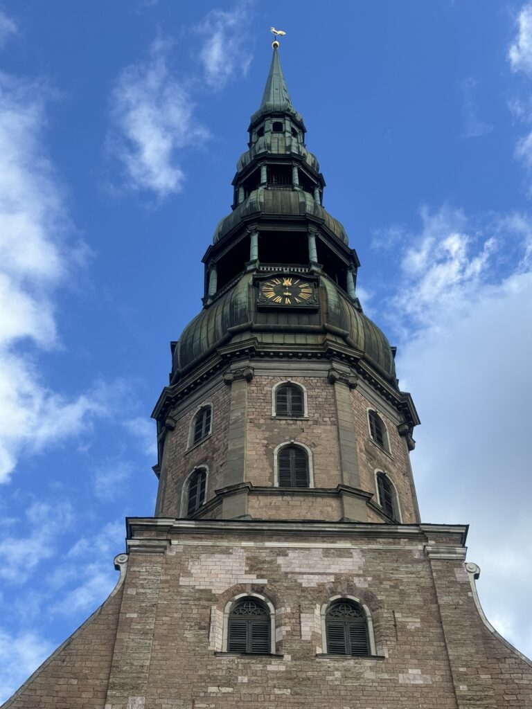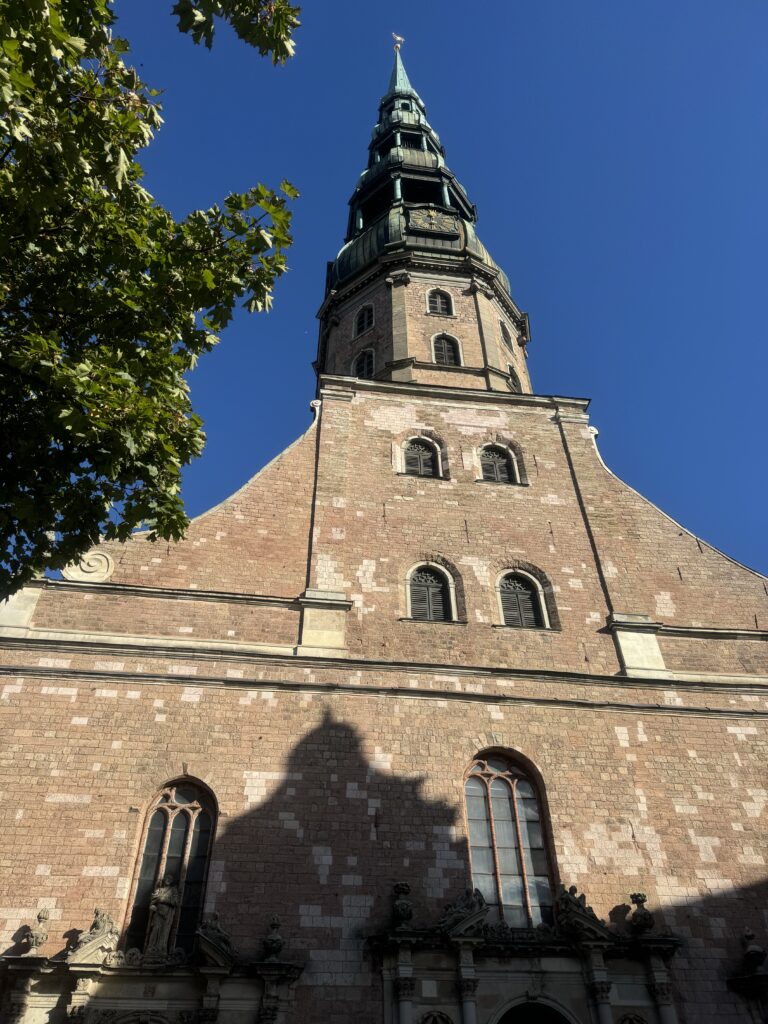 Kościół świętego Piotra był najbliżej mojego locum, od niego więc rozpoczęłam przygodę z Rygą. To bardzo okazała świątynia luterańska, w pierwszej chwili pomyliłam ją z katedrą. Jej początki sięgają XIII wieku, ale obecny wygląd zawdzięcza latom późniejszym, a nawet całkiem niedawnym. Ogromny, wysoki fronton z wieżą z zegarem (który ponoć ma tylko jedną wskazówkę) był zapowiedzią ciekawego wnętrza.