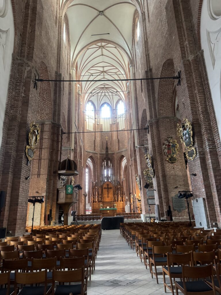 To kolejny wielki gotycki kościół, którego bryłę urozmaica wieża ze strzelistym dachem – tym razem katolicki. Koleje jego losów bywały różne – działał wcześniej jako kościół luterański, katolicki, a nawet jako magazyn żywnościowy. Z tą katedrą wiąże się postać znamienitego polskiego mówcy, Piotra Skargi, który tutaj miał przez pewien czas, na przełomie XVI i XVII wieku, wygłaszać swe kazania..