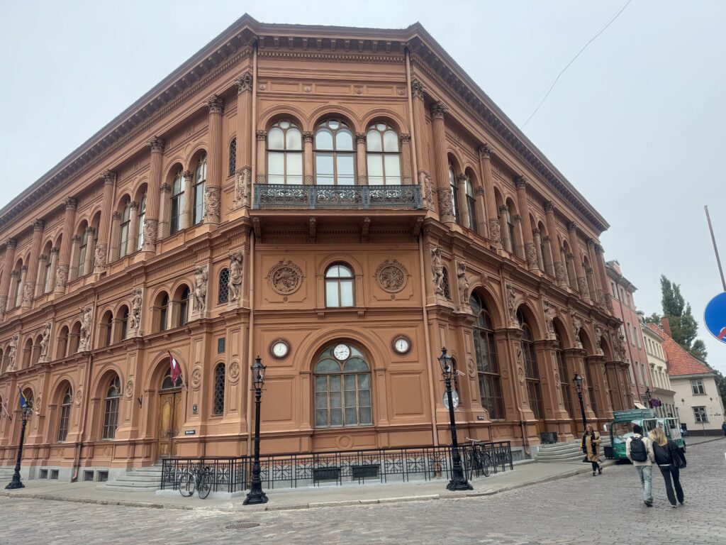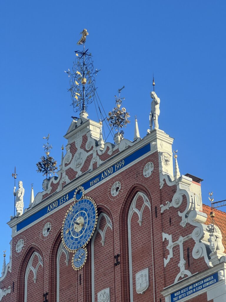 W odległości około 200-300 metrów od kościoła św. Piotra, znajdziemy kolejną atrakcję – Dom Bractwa Czarnogłowych. Stoi na okazałym Placu Ratuszowym, który jedną stroną jest jak gdyby otwarty ku bulwarom nad Dźwiną. Budynek Bractwa naprawdę zachwyca, zarówno architekturą, jak i historią. Jest po prostu ładny – bogato zdobiony, kolorowy. Powstał w XIV wieku jako siedziba gildii kupieckiej, co wyraźnie pokazuje związki miasta z Hanzą.