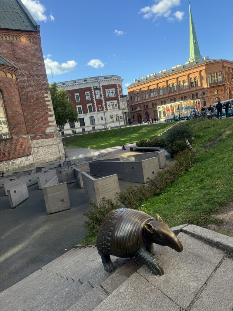 Na Placu Katedralnym znajdziemy parę zabawnych instalacji (choć niektóre pewnie czasowo). Zaskoczenie wywołał u mnie pancernik z brązu wędrujący po schodach i ciekawa instalacja z drewna, sklejki, luster, z ławeczkami i hamakami, gdzie można było wejść, odpocząć, przyglądając się katedrze.