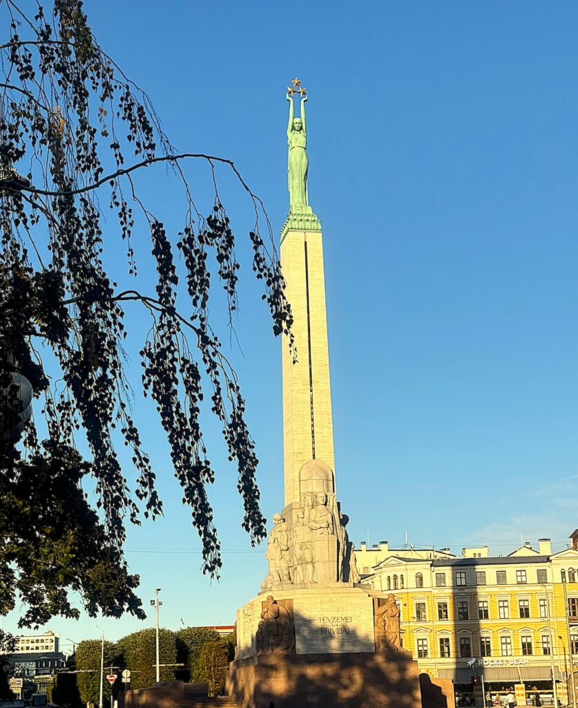 Ta strzelista, wysoka kolumna jest monumentalnym symbolem wolności Łotwy. Pomnik wzniesiono w 1935 roku dzięki hojności mieszkańców. Choć wydaje się prosta, składa się aż z 56 rzeźb w 13 grupach, rozmieszczonych na 4 poziomach pomnika wolności. Na szczycie 42-metrowego obelisku postawiono dziewięciometrowy symbol wolności – młodą kobietę trzymającą 3 gwiazdy nad głową.