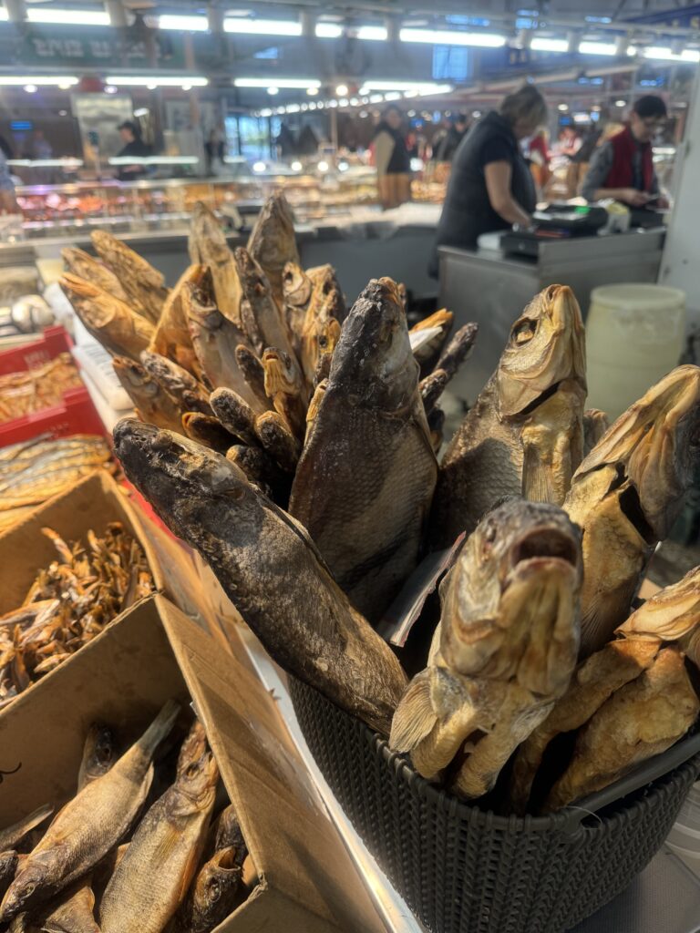 Wędrując pod hale targowe zabierzcie ze sobą ochotę na zakupy! Najpierw mamy duże targowisko zewnętrzne, głównie z warzywami, owocami i – o tej porze roku – grzybami, borówkami, ale także wszelkiej maści stragany ze wszystkim. Hale są podzielone według asortymentu: mamy hale z serami i nabiałem, kolejną z mięsem i jego przetworami, halę gastronomiczną, jest osobna hala z rybami i owocami morza. Ta zwykle bywa dla mnie najciekawsza, choć tutaj (północ!) wiele miejsca zajmowały ryby suszone i wędzone.