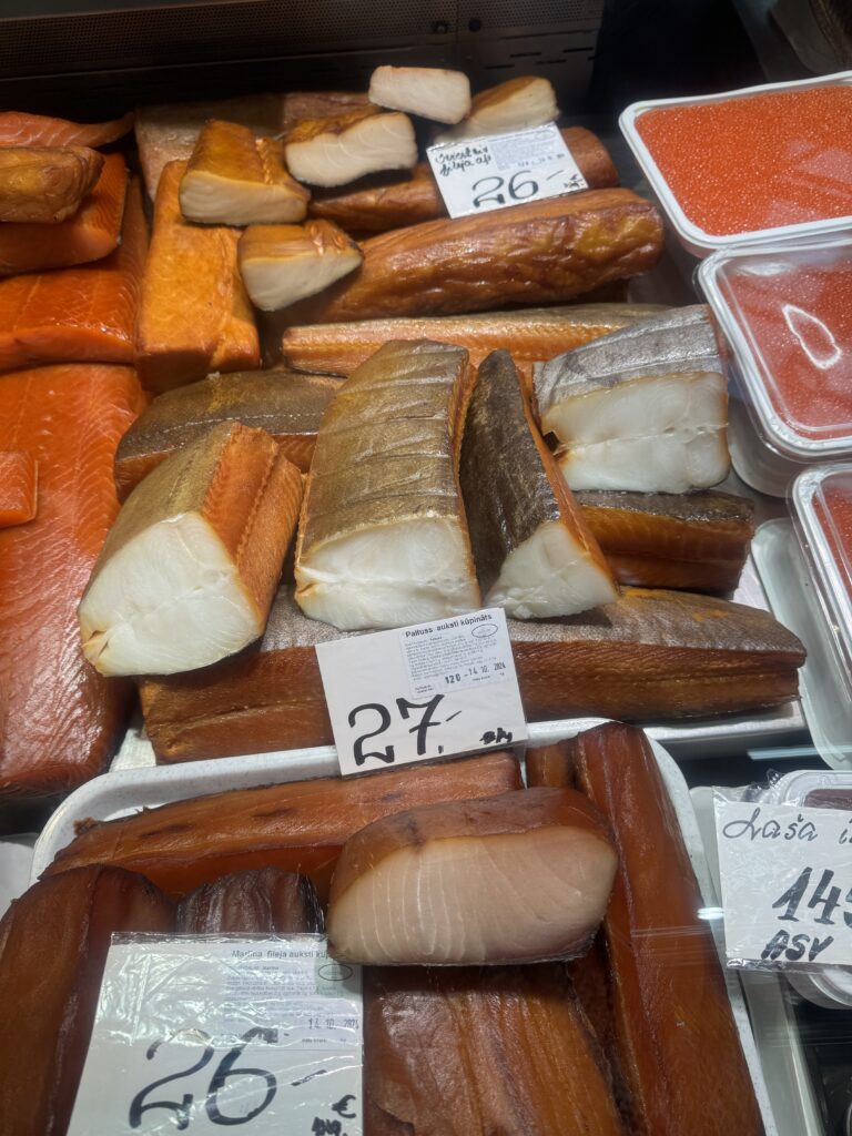 - Wędzone ryby na Targu Centralnym (jest wędzony karp, makrela wędzona z migdałami albo serem, halibut, łosoś, ryba maślana, słynne ryskie szprotki); spróbowałam kilku