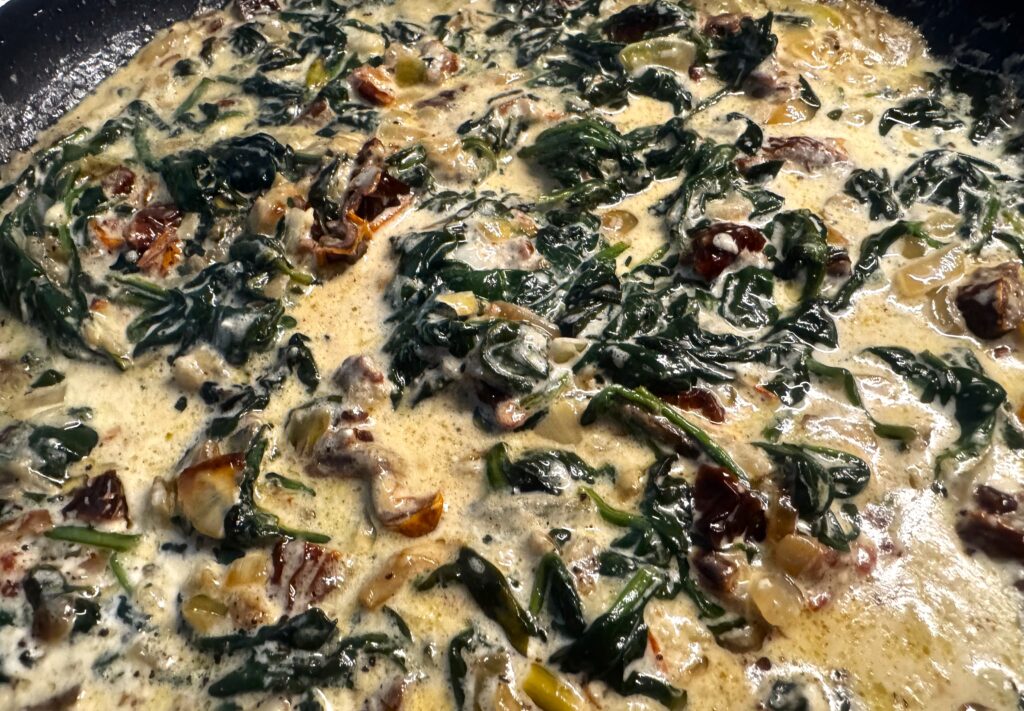 Na patelni rozgrzać 2 łyżki oliwy, wrzucić cebulę i chwilę ją podsmażyć. Następnie rozgarnąć ją na boki patelni i na środku podsmażyć krótko 2 ząbki posiekanego czosnku. Podlać całość nieco oliwą i stopniowo wrzucać szpinak – powinno się udać na około 3 razy, szpinak musi stracić objętość (zostawić kilka listków do dekoracji). Pomidory pokrojone na mniejsze kawałki wrzucać do szpinaku; można podlać wszystko odrobiną oliwy z pomidorów. Posolić, popieprzyć. Wlać całą śmietankę. Wcisnąć trzeci ząbek czosnku i dosypać parmezan.