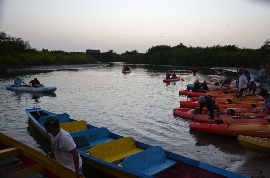 Wycieczka kajakiem jest proponowana zwykle przez organizatorów wyjazdów do Gambii. Wyjazd z hoteli jeszcze przed świtem, by dotrzeć busami na miejsce startu – trawiasty brzeg rzeki z poustawianymi kajakami i łodziami. Wycieczkę zaczynamy na obrzeżach Parku w Tanji Bird Reserve . Można płynąć kajakiem, a w razie braku partnera czy ochoty na wiosłowanie – większymi nieco, kolorowymi pirogami dla kilku osób, ze sterniko-wioślarzem. Korzystam z tej drugiej opcji.