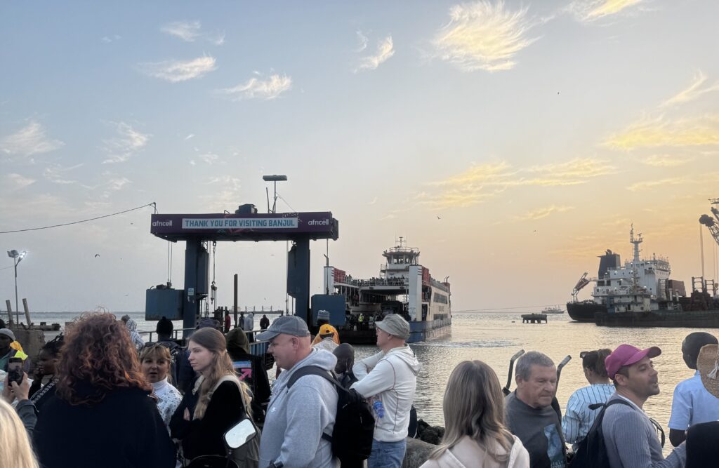Po zwiedzeniu parku i posiłku znów przejażdżka do granicy, kontrole, upał, kurz, oczekiwanie na wejście na prom i przeprawa o zachodzie słońca. Gdy przybijamy do Bandżul jest już ciemno.