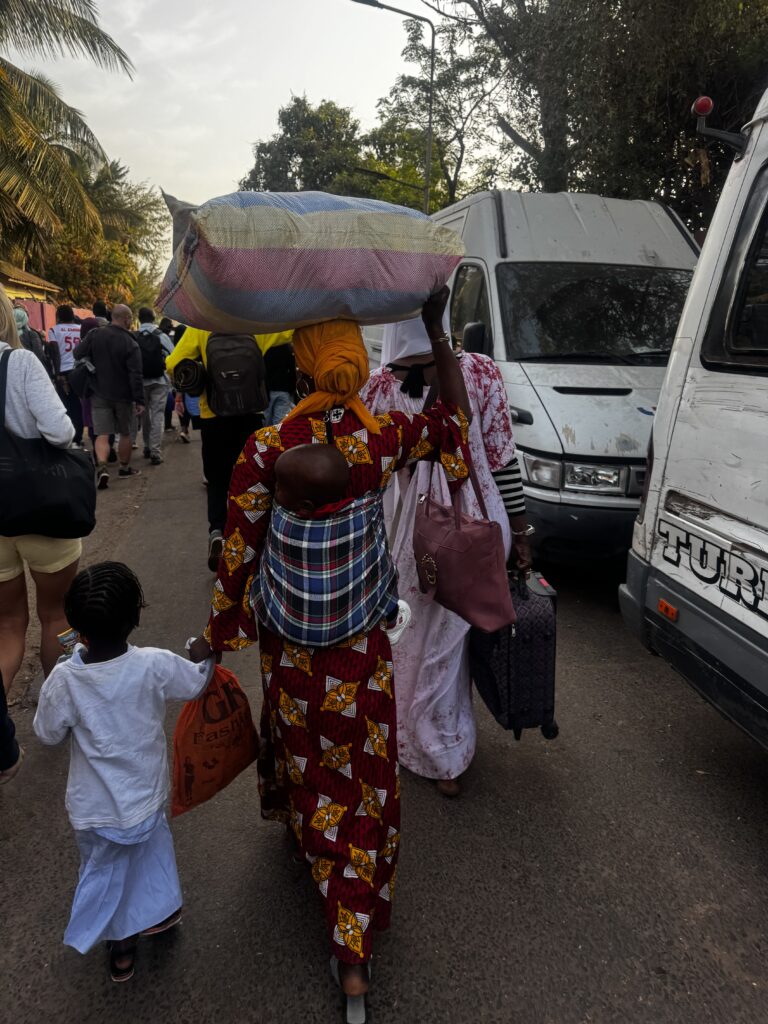 Gdy prom przybywa do Barra, fala ludzi wylewa się długą, barwną falą przez miasteczko. Teraz musimy dojść do naszego busika. W drodze powrotnej, mimo długiego oczekiwania na prom w lokalnej restauracji, wsiedliśmy na pokład, za to bus nie wjechał! Nie załapał się po prostu. Wsiadając mijaliśmy ogromną kolejkę samochodów, dymiących tak cuchnącymi spalinami (na czym oni jeżdżą?), że musiałam zasłaniać twarz. „This is Africa!” – rzucił widząc to młodzieniec przy kopcących pojazdach.