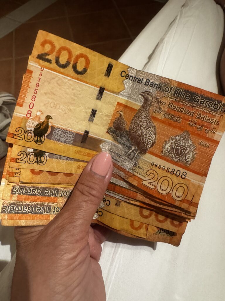 & Gambia to bardzo biedny kraj; walutą jest dalasi (przelicznik 2025 – 1 GMD=0,06 PLN czyli 100 dalasi jest warte około 6 zł. a 1 USD= około 72 dalasi), najczęstsze w obiegu wśród turystów jest 100 i 200 dalasi. Mniejsze banknoty są zwykle niewyobrażalnie wprost zniszczone. Płaci się niemal wyłącznie gotówką. Trzeba dodać, że chleb kosztuje tu kilkanaście dalasi. Za ładne pareo na przykład w hotelu płaciłam 500 GMD.