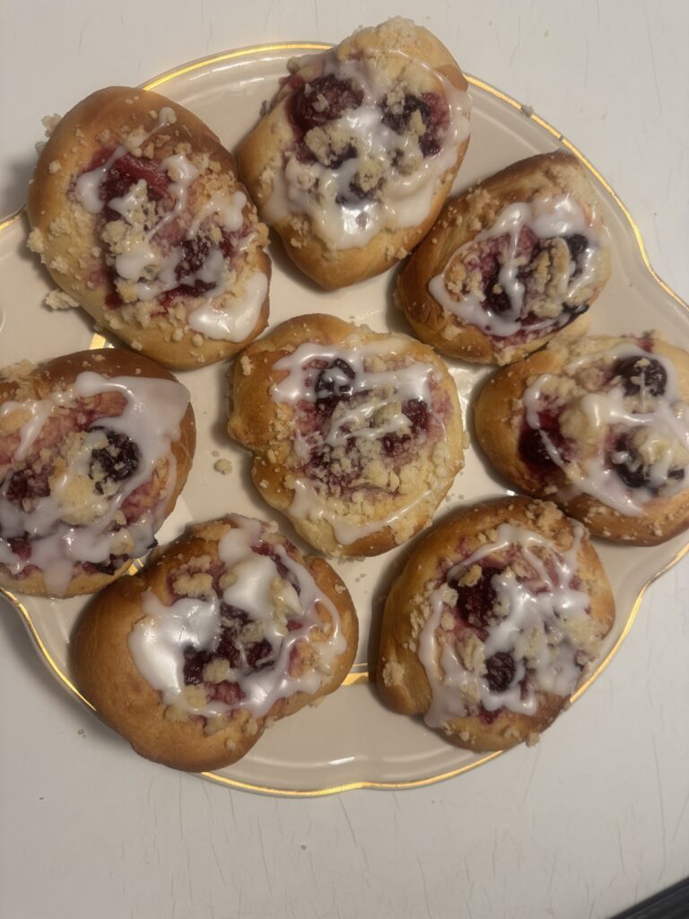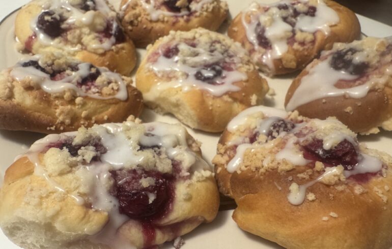 Są jeszcze jednym wariantem ciasta drożdżowego. Tu i ówdzie nazywają je sznekami lub nawet sznekami z glancem. Tym, co w nich można zmieniać, są owoce, wchodząc w zależność od pory roku. Według mnie najlepsze są właśnie z wiśniami (nadają się też mrożone) i śliwkami (kawałkami śliwek). Można je upiec z truskawkami, czy malinami, będą również przepyszne, z tym, że truskawki są ciut „za mokre”, a maliny za suche. To moja opinia.